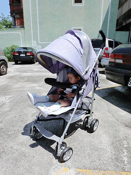 喬喬躺在推車中蘊釀睡覺情緒,從腳蹺高的程度表示很舒適哈哈