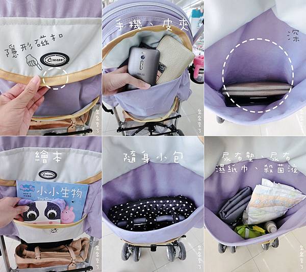 【置物口袋】推車後面有兩個置物口袋,其中一個還有隱形磁扣,這個設計讓父母好方便!