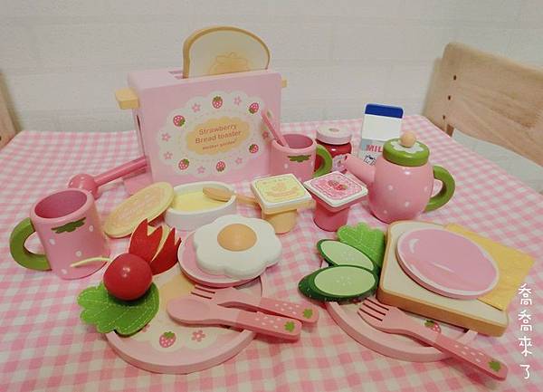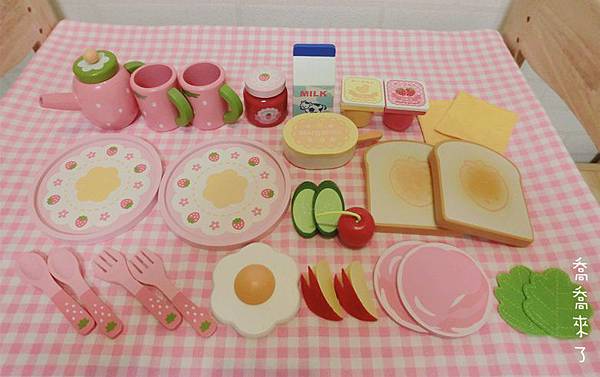 所有的配件木玩,茶壺、茶杯、餐盤、刀叉、牛奶、奶油、果醬、土司、起士、菜肉、水果,還有一台烤麵包機唷!
