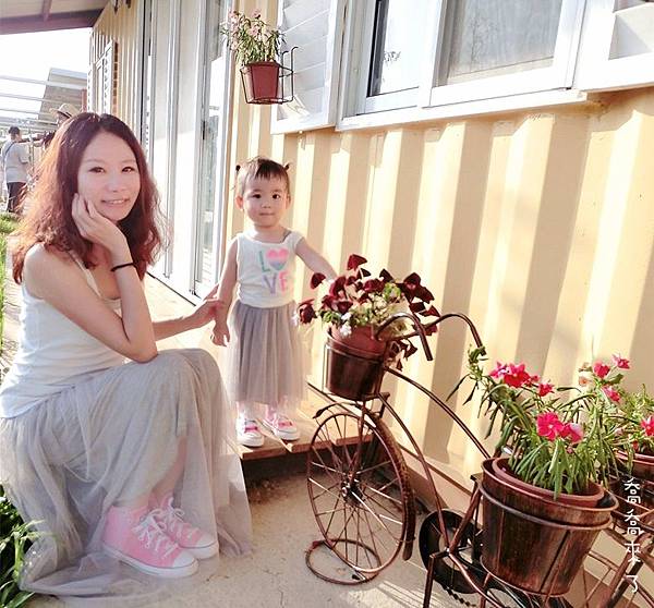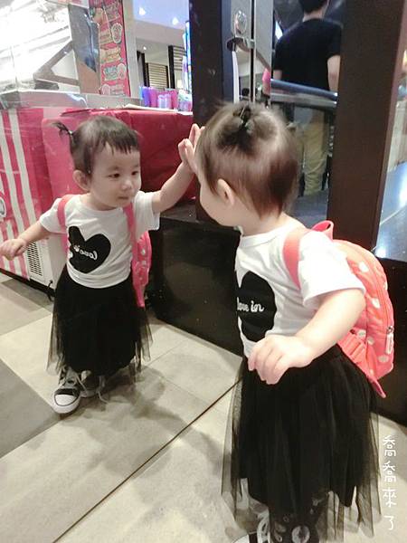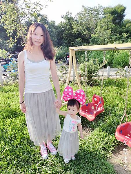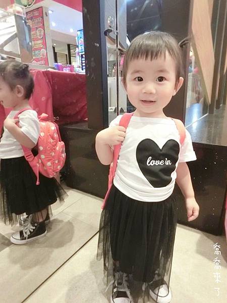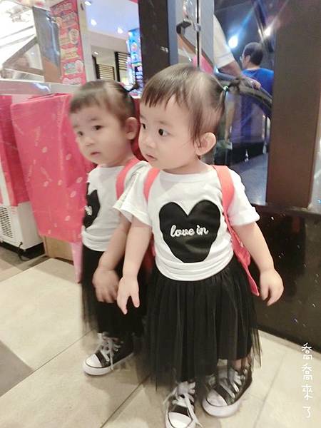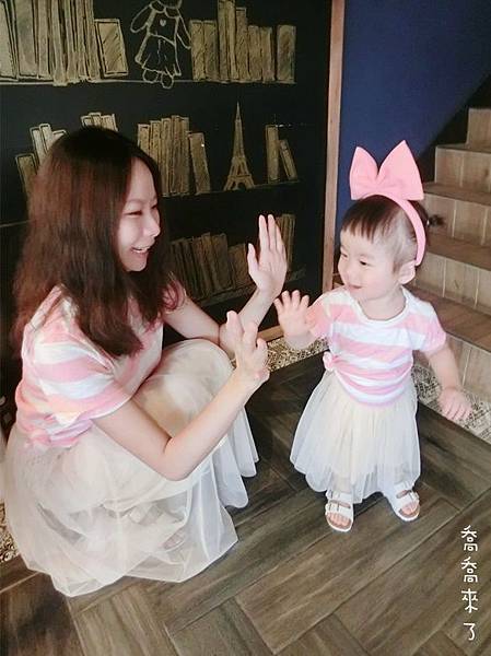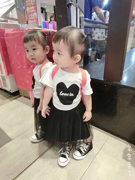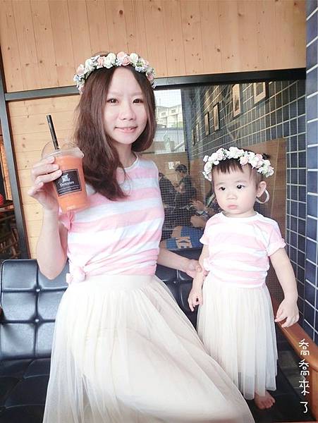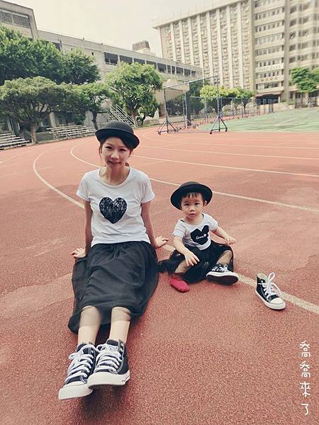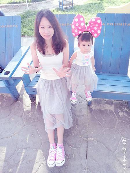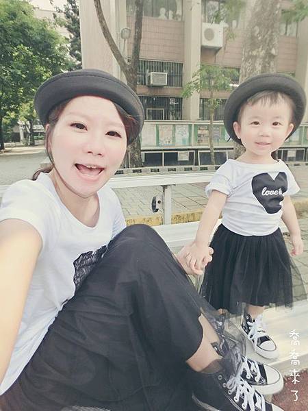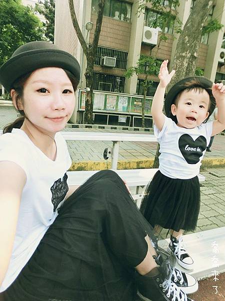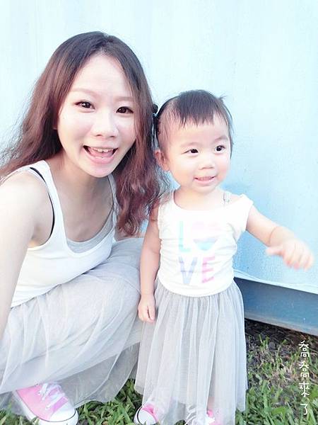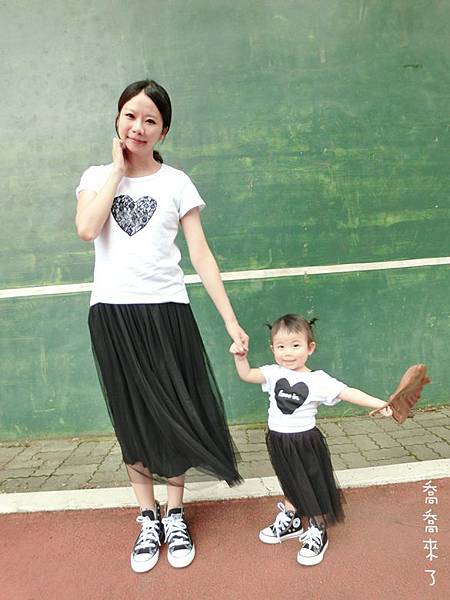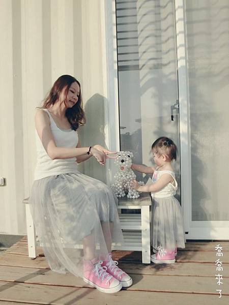 沒想到灰色搭淺色也行得通!我跟喬喬都搭了白色背心!